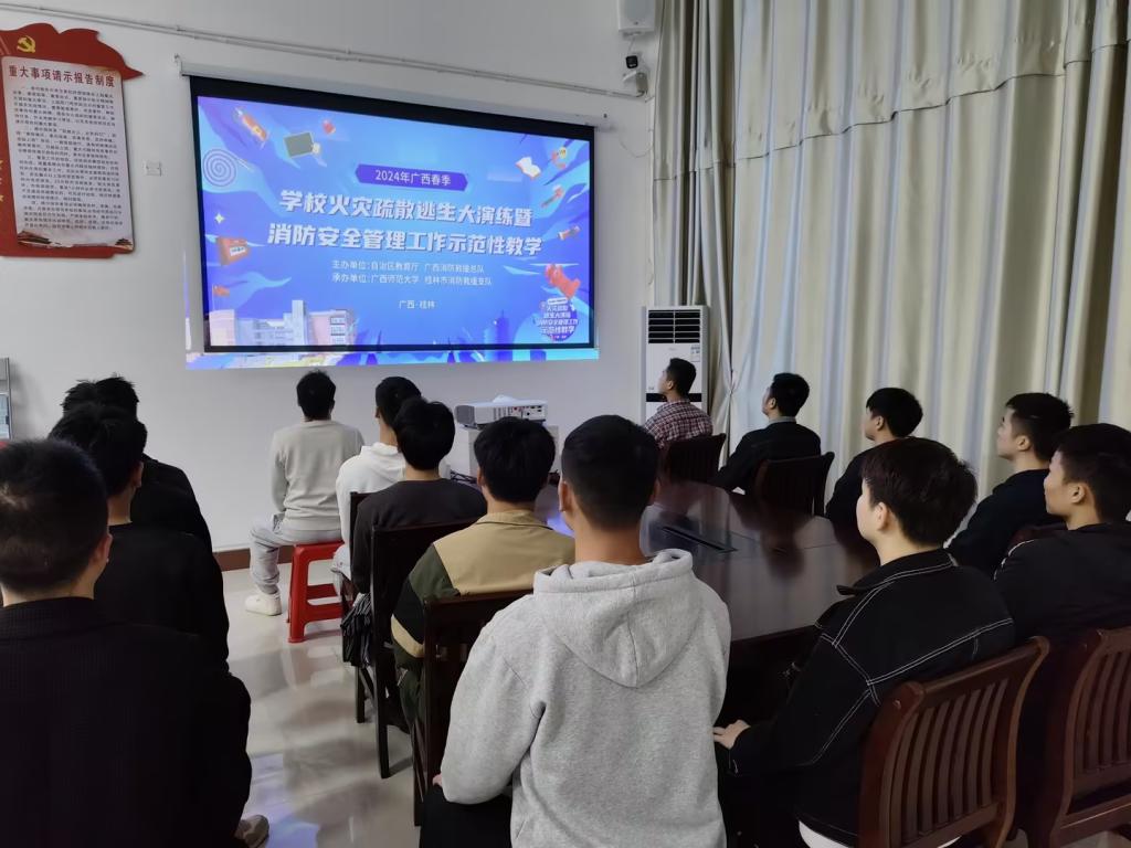 武装部组织退役大学生观看“2024年广西春季学校火灾疏散逃生大演练暨消防安全管理工作示范性教学”