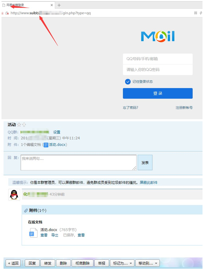 近段陆续有师生发映个人邮箱收到主题为“【学籍】变更通告(以此为准)”和“19届查询录取通知书”的邮件,用户打开邮件后,邮件正文会有类似“点击阅读查看”和“查询录取通知书”的链接,单击后会出现要求用户输入QQ用户名和密码的登陆界面,邮件正文及单击链接后的页面内容如下图所示。