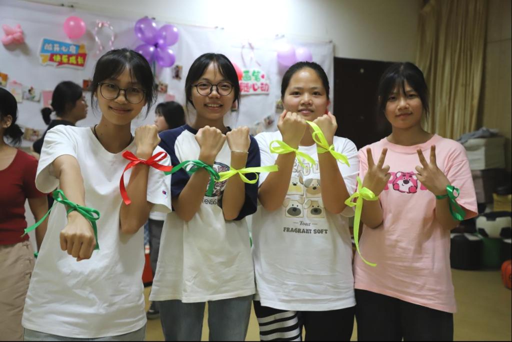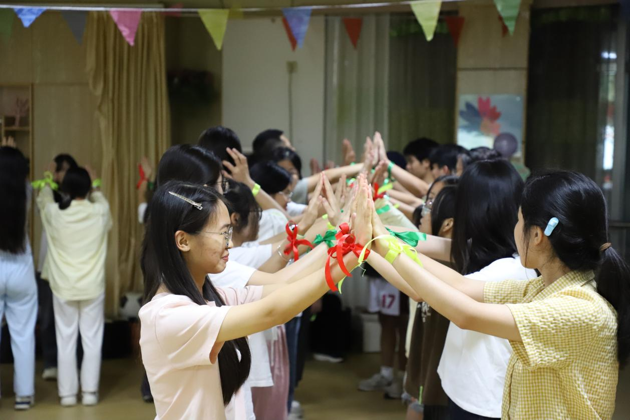 随后,活动进入“祝福彩虹桥”环节。同学们在明信片上写下对彼此的真诚祝福与鼓励,并将手中的彩色丝带系在同伴的手腕上。随着丝带的传递,“彩虹桥”逐渐成形,象征着同学们之间深厚的情谊与支持。大家依次穿过“彩虹桥”,收获满满的祝福与感动,现场氛围温馨而感人。