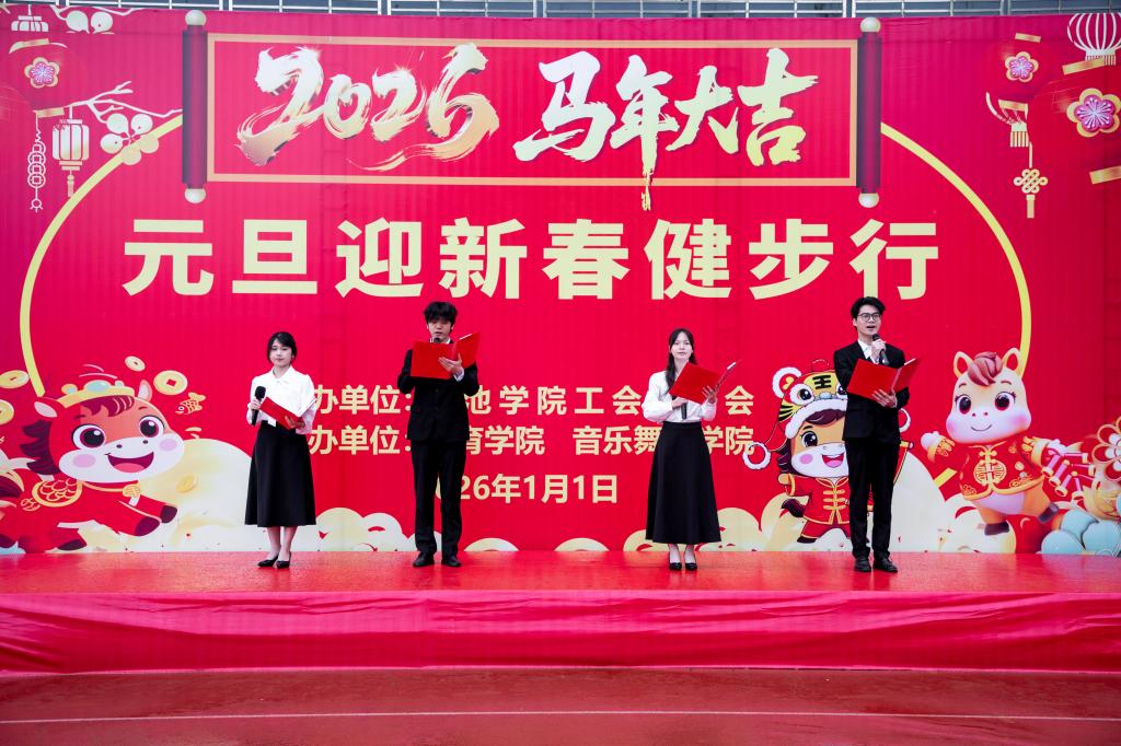 为迎接2026年元旦佳节,营造浓厚的新年氛围,丰富教职工业余文化生活,践行全民健身理念,1月1日上午,我校举办2026年元旦迎新春校园健步走活动。学校党委书记甘毅、校长马少健,全体校领导、工会会员代表等参加活动。