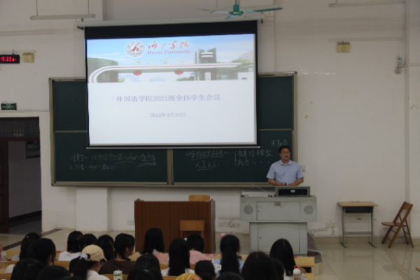 2022年4月12日晚外国语学院于格致楼负101开展外国语学院2021级全体学生会议。此次会议由韩欢主持,21级全体学生参与会议。