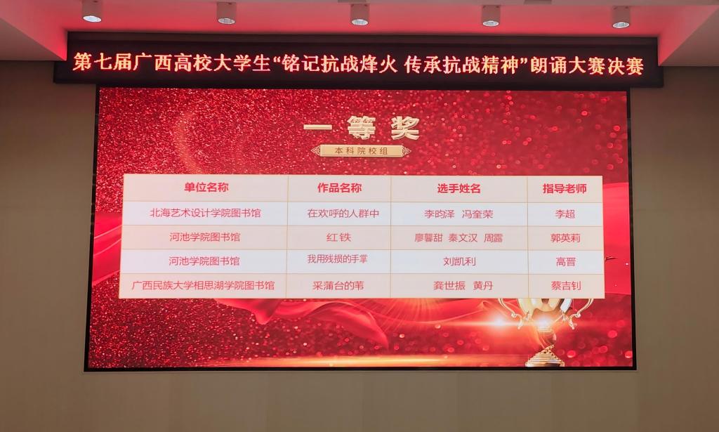 2025年11月16日,由广西高等教育学会图书馆专业委员会主办的第七届广西高校大学生“铭记抗战烽火 传承抗战精神”朗诵大赛在南宁师范大学明秀校区圆满落幕。本次大赛汇聚了全区各高校的优秀代表队,竞争激烈,精彩纷呈。