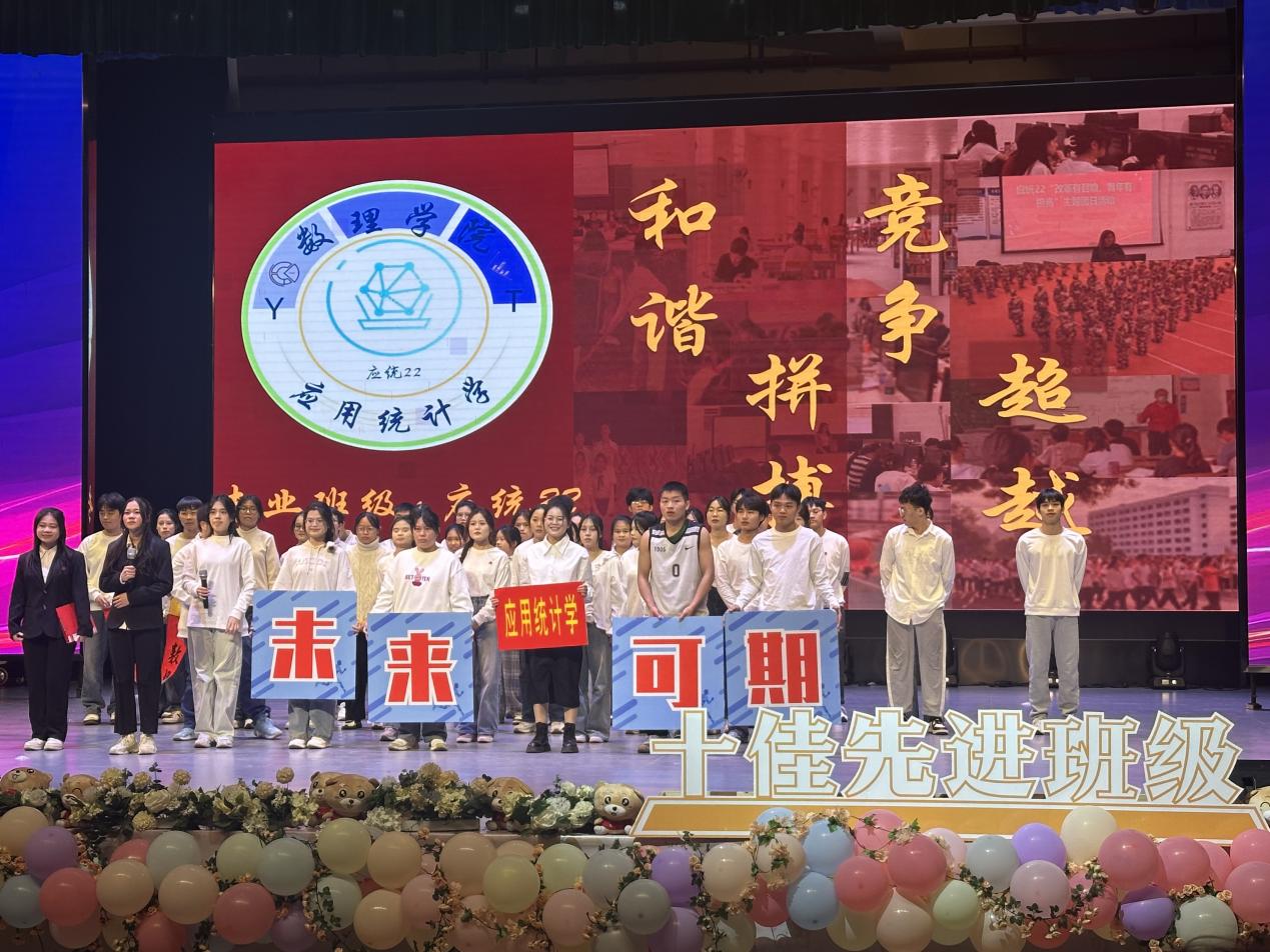 12月16日晚,河池学院2024年十佳先进班级评选答辩会在艺术楼表演厅举行,我院数学与应用数学221班、应用统计学22班两个班级参加评选。我院两个班级通过PPT、小视频展示和文艺创作表演等丰富多彩的形式,全面展示了班级建设、学风建设、专业学习、技能竞赛、科研活动、文体活动、志愿服务、社会实践以及校园生活等方面的丰硕成果。在激烈的角逐中,我院两个班级取得优异成绩,荣获2024年河池学院十佳先进班级。