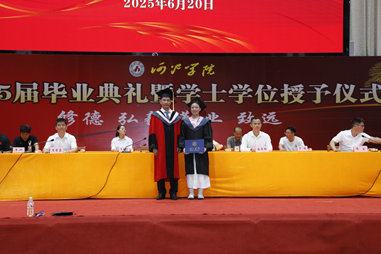 在学士学位授予仪式中,毕业生们依次上台,院长蓝建卓教授着导师服为毕业生颁发学位证书并正冠拨穗,祝同学们顺利毕业。