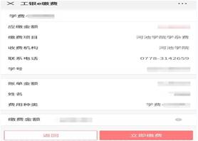 2.中国工商银行缴费:学生在办理缴费业务时与经办柜员说明办理工银e缴费业务(9551交易),报上院校名称(河池学院)、学生学号,然后将学杂费缴存银行,即可完成缴费。(仅限广西区内)