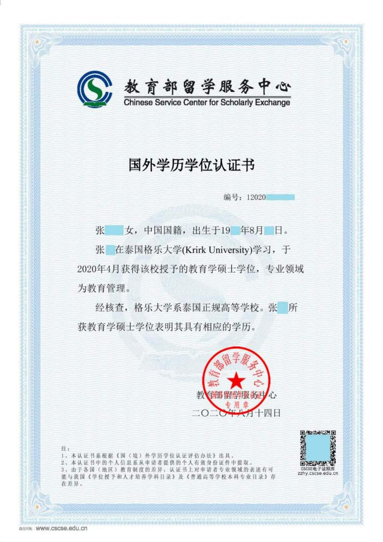 国(境)外学历学位认证书示例