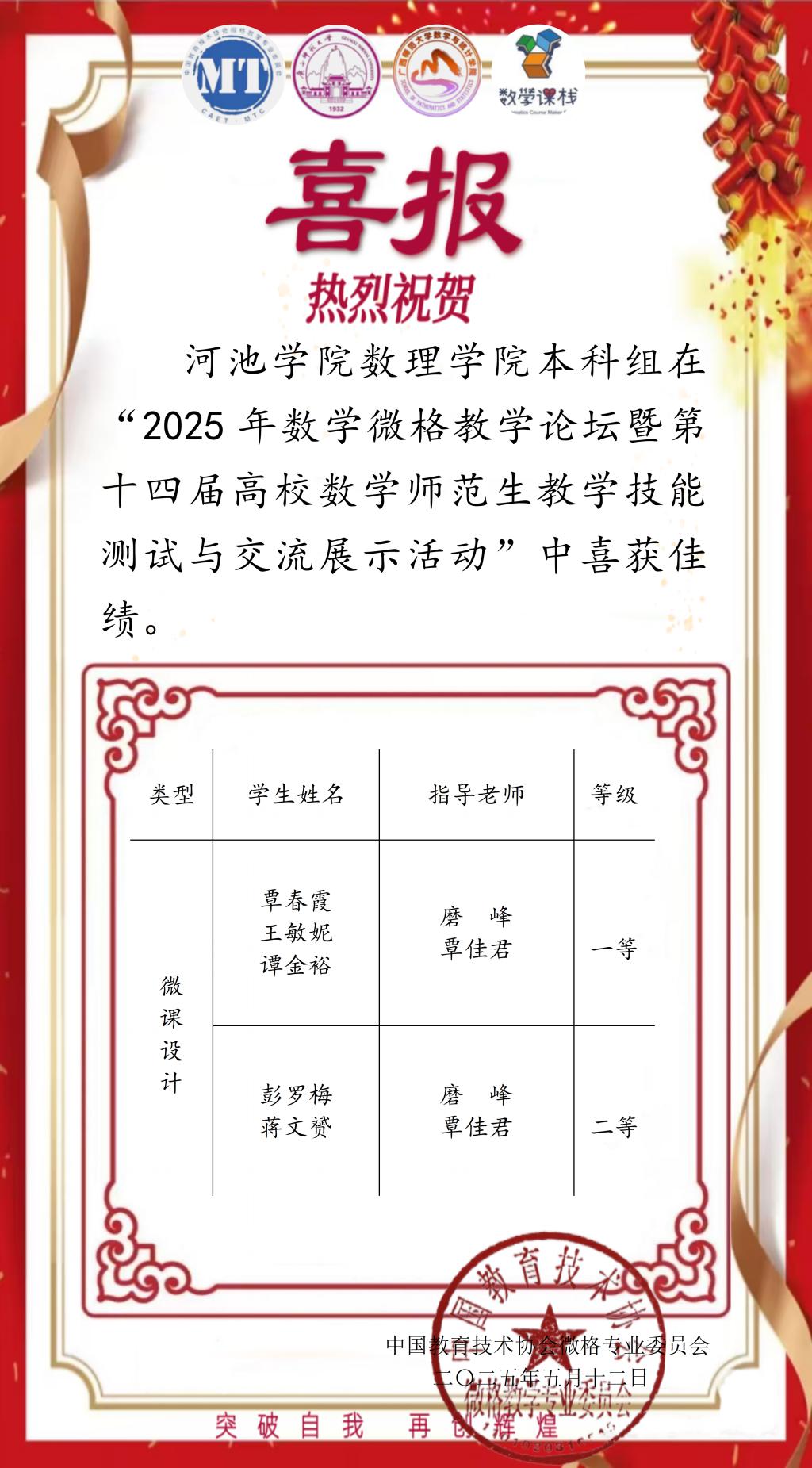 近日,2025年数学微格教学论坛暨第十四届高校数学师范生教学技能测试与交流展示活动在广西师范大学举行。我校数理学院选派5名学生参加比赛并获奖,其中覃春霞、王敏妮、谭金裕团队荣获一等奖,彭罗梅、蒋文赟团队荣获二等奖。