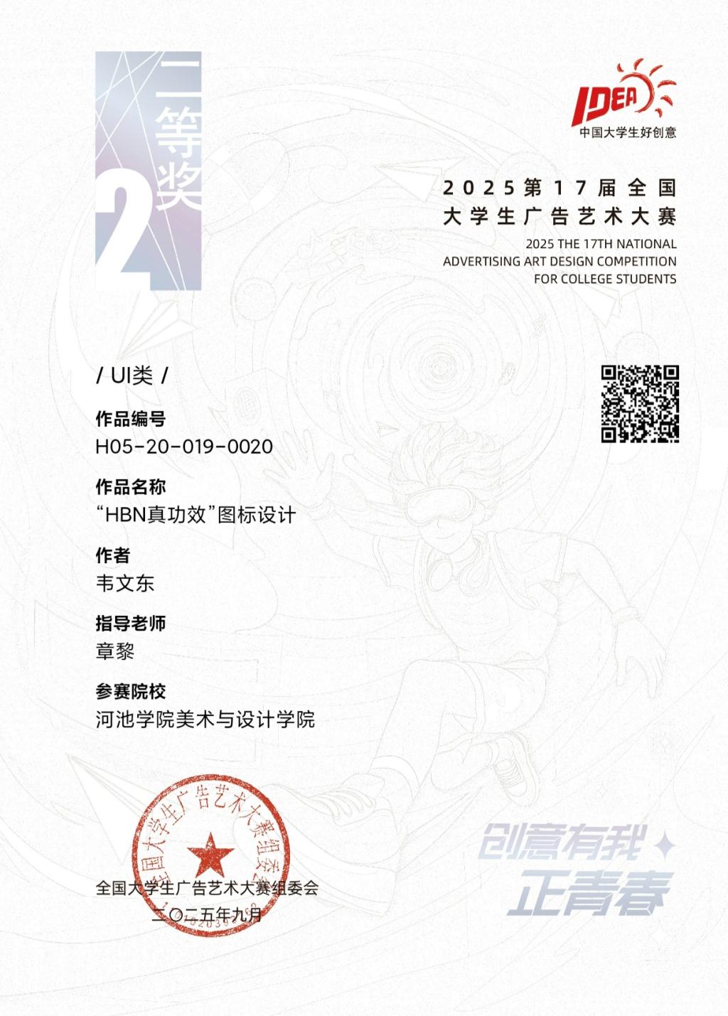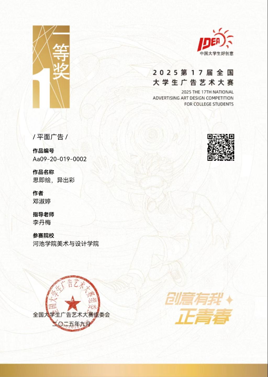 其中,2023级视觉传达设计专业邓淑婷同学的作品《思即绘,异出彩》以独特的创意表达与精湛的视觉呈现,夺得平面类全国一等奖。2022级视觉传达设计专业林叶怡同学的平面类作品《节日净齿,纳爱斯有礼》、韦文东同学的UI类作品《“HBN真功效”图标设计》分别获全国二等奖。