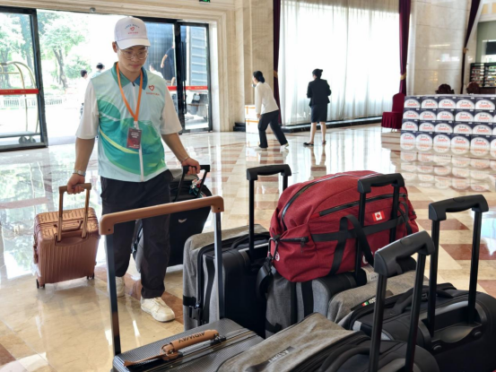 指尖翻飞间,我将选手的衣物包逐一整理妥帖,每一件衣物的妥善收纳,都让我深刻体悟到志愿服务的价值——微小的细致,恰是赛事顺畅运行的基石。选手寄存衣物时,常好奇询问广西风光,我一边指向岸边隐约的刘三姐故里歌台,一边即时用英语讲述歌仙传歌的故事。看到他们泛起向往的眼神,我心底也泛起了广西生动的名片。外国选手用“老表”打招呼,我们用对方的语言回应。我既是保管员,亦是文化使者,期待广西以体育为桥,让世界爱上这里的山水风情,让全民健身的种子生根发芽。