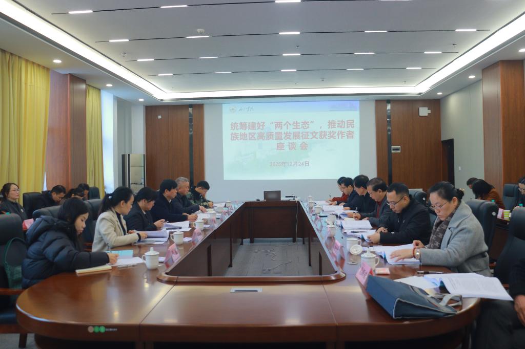 12月24日,“统筹建好‘两个生态’,推动民族地区高质量发展”征文获奖作者座谈交流会在我校举行。中共河池市委党校常务副校长苏灵、副校长韦克斌,我校党委常委、统战部部长罗昌勤,马克思主义学院相关领导、获奖论文作者代表及其他教师代表参加座谈会。