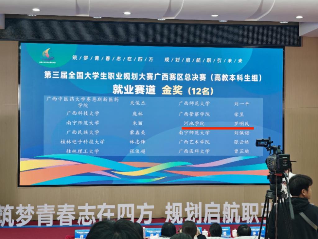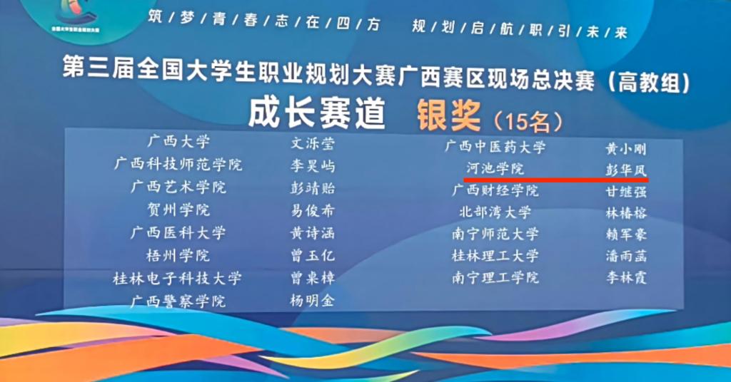 此次成绩的取得,是我校“我·河·你”一体化大思政课育人成果的生动实践与有力彰显。一直以来,学校深耕“我·河·你”育人理念,以“我”为核心激发学子内生成长动力,以“河”为纽带厚植学子扎根河池、服务地方的家国情怀,以“你”为支撑凝聚师生协同、家校社联动的育人合力,构建起全方位、立体化的育人生态。获奖学子将个人职业理想融入时代发展浪潮与地方建设需求,在备赛过程中锤炼专业本领、坚定初心使命,生动诠释了河院学子“筑梦青春志在四方,规划启航职引未来”的责任与担当。