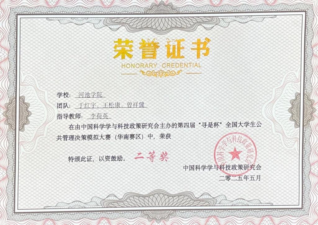 5月10日至11日,第四届“寻是杯”全国大学生公共管理决策模拟大赛(华南赛区)在华南理工大学举办。经过激烈角逐,我校公共管理学院行政管理专业2023级于红宇、曾祥健、王松康等3位同学组成的代表队(指导老师:李荷英)荣获大赛二等奖。