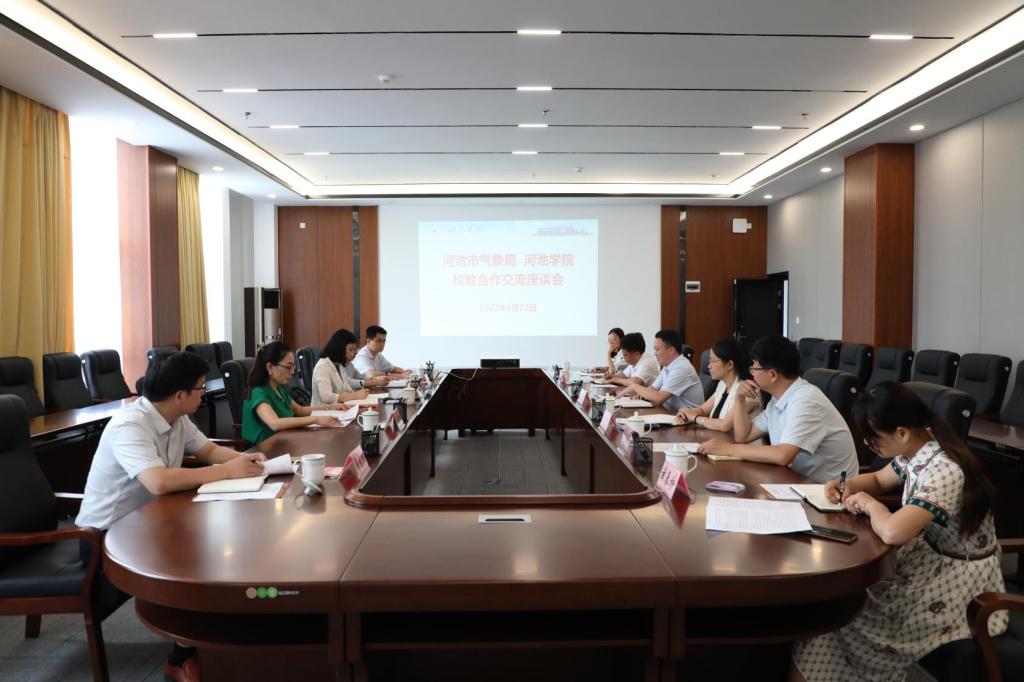 6月22日上午,河池市气象局党组成员、纪检组长罗雅等一行5人到我校开展局校合作交流座谈会。科学技术管理处处长李晓东、学生工作部、教务处等相关职能部门领导参加了座谈。