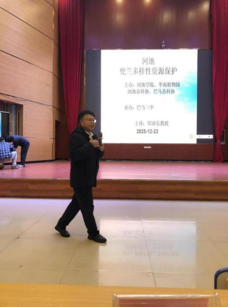 2025年12月23日至24日,河池学院联合中国科学院华南植物园、河池乐康生态农业科技有限公司,在广西巴马瑶族自治县重点中学开展系列生态保护主题活动。活动以兰科植物科普报告会与国家I级保护植物猪血木(Euryodendron excelsum H. T. Chang)校园回归种植为核心,为巴马三中、巴马高中的学子们搭建起理论与实践相结合的生态教育平台,用科技力量助力乡村生态振兴与生物多样性保护。