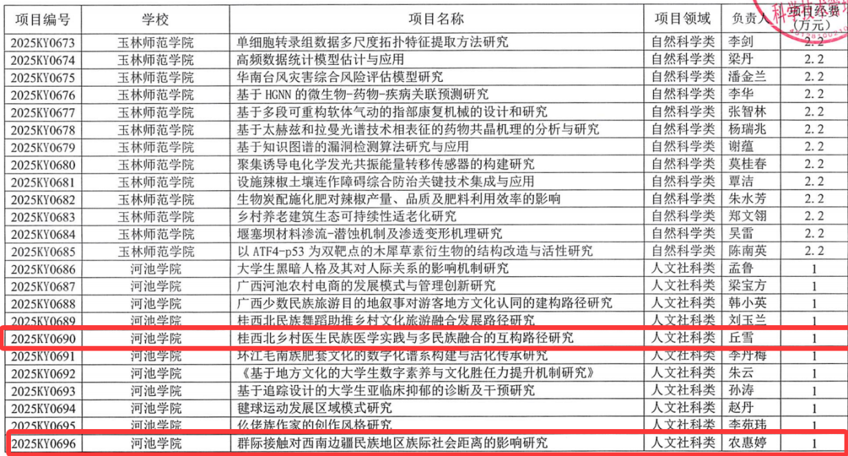 据《自治区教育厅关于公布 2025 年度广西高校中青年教师科研基础能力提升项目名单的通知》(桂教科研〔20251 号)中获悉,我院教师丘雪主持的“桂西北乡村医生民族医学实践与多民族融合的互构路径研究”课题、农惠婷主持的“群际接触对西南边疆民族地区族际社会距离的影响研究”课题获2025 年度广西高校中青年教师科研基础能力提升项目立项。(作者:宾娜 校对:钟卓良、覃露兴 审核:韦福)