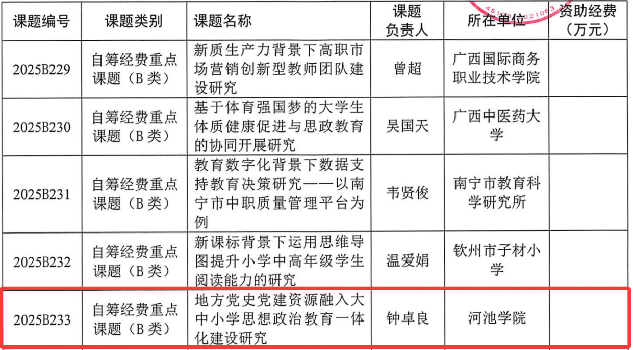 近日,从《广西教育科学规划领导小组关于公布广西教育科学“十四五”规划2025 年度课题的通知》(桂教科学〔20252 号)中获悉,我院钟卓良教授主持的“地方党史党建资源融入大中小学思想政治教育一体化建设研究”课题获广西教育科学“十四五”规划 2025 年度课题立项。