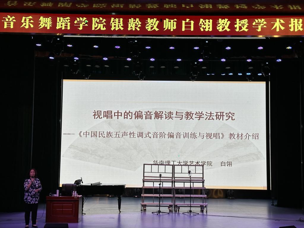 4月19日下午,音乐舞蹈学院在表演厅举办《视唱中的偏音解读与教学法研究——<中国民族五声性调式音阶偏音训练与视唱>教材介绍》学术报告,银龄教师、华南理工大学艺术学院白翎教授担任主讲人。学院领导、全体教师和音乐专业学生到场聆听报告。